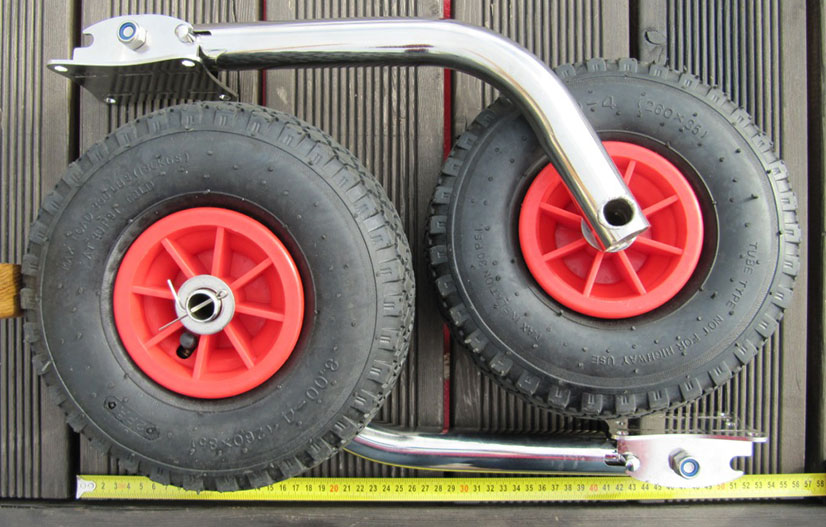 Подобные конструкции ориентированы на транспортировку лодки одним человеком на не большие расстояния. Они устанавливаются с помощью 4-х болтов к транцу, сделанному из фанеры. Имеется возможность регулировки высоты их установки благодаря длине крепежной шпильки.
