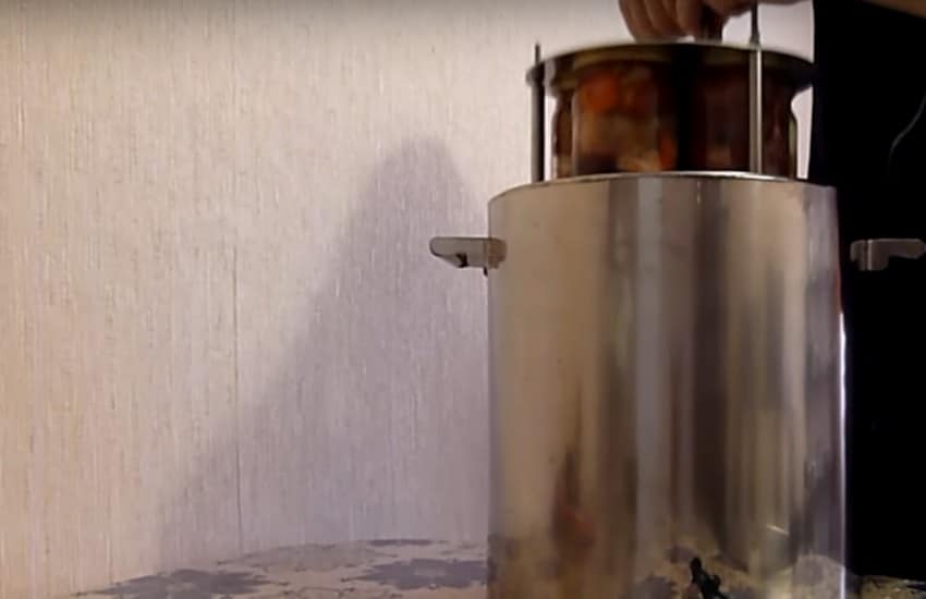 - Погружаем банки в автоклав. Заливаем в него воду, не забываем оставить небольшой воздушный зазор в 2-3 см и ставим на нагрев. Ждем выхода устройства на температуру в 120°С, консервируем 15 минут и выключаем нагрев. После того, как автоклав остынет и давление упадет до 0, можем доставать готовые консервы.
