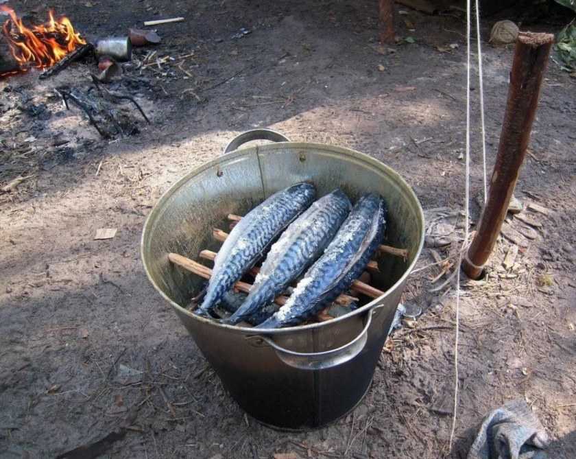 Поставьте на огонь закрытое крышкой ведро. Копчение должно завершиться, до этого снимать крышку не следует.