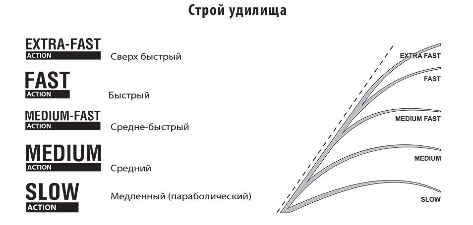 Строй удилищ для некоторых рыболовов имеет важное значение, в основном из-за сложившихся стереотипов, и маркетологи компаний этим пользуются. Но этот параметр весьма факультативен. . Следует понимать, что по настоящему сверхбыстрым строем обладают спиннинги с мягкой вклеенной вершинкой (Кстати, вклейка на спиннинге обычно обозначается латинской буквой «S»). В случае со обычными тубулярными вершинками (обозначается буквой «T»), это деление условно