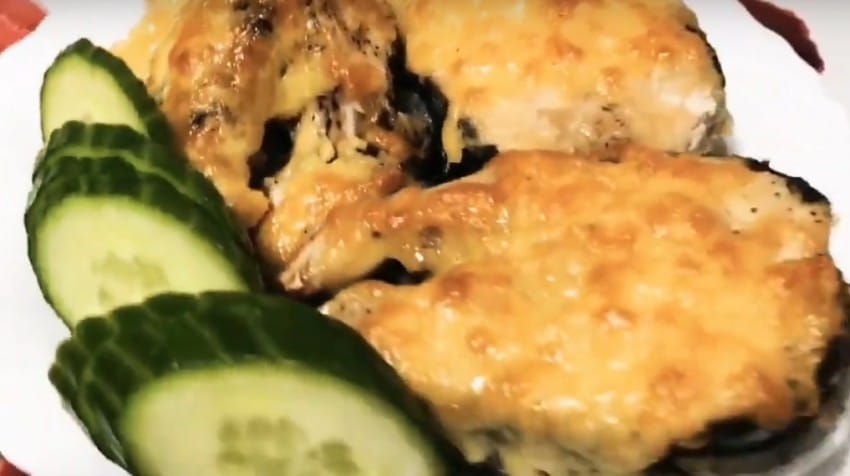 - Украшаю запеченные кусочки полукольцами лимона, оливками и икрой. Подаю на стол вместе с картофелем или рисом.