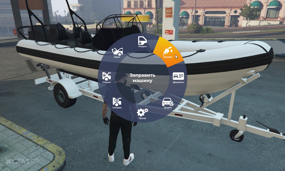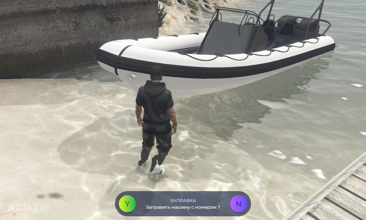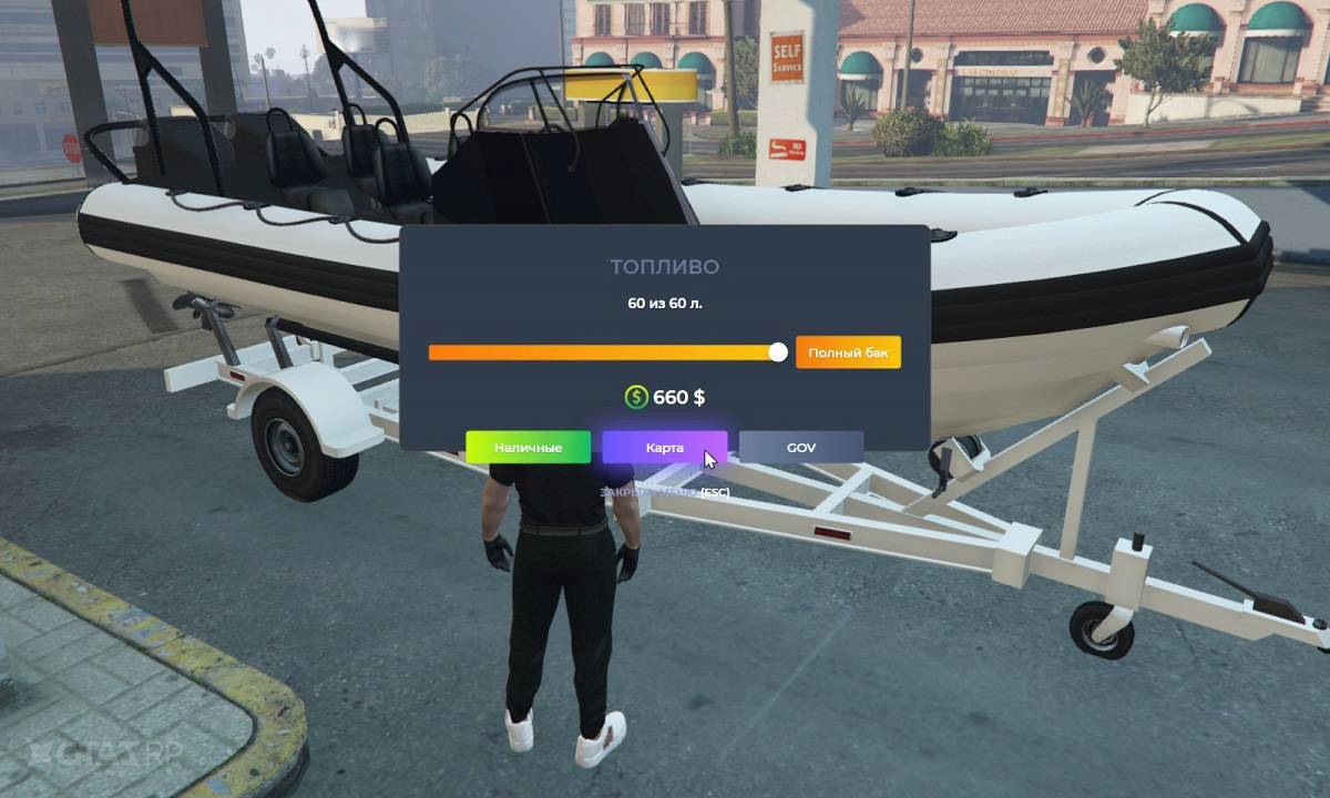 Подъехав к бензоколонке подходите к лодке, открываете меню нажав на «G», выбираете пункт «Заправка», в появившемся окне указываете необходимое количество литров через ползунок и оплачиваете выбрав «Наличные» или «Карту».