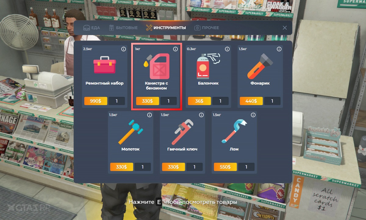 - В любом магазине 24/7 купите канистру с бензином, подойдите к лодке, открыв инвентарь кликните по ячейке с канистрой, выберите пункт «Использовать» и в появившемся окне нажмите на «Y», чтобы подтвердить заправку.