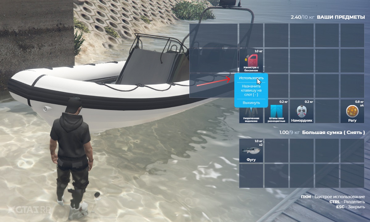 Купив канистру подходите к вашей лодке, открываете инвентарь, кликаете по ячейке с канистрой и выбираете пункт «Использовать».