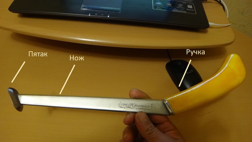 На одном конце ножа расположена ручка, чаще из дерева, но изготавливаются также текстолитовые, пластиковые или прорезиненные ручки. На другом конце перпендикулярно полотну ножа (ноги) приклепывается, приклеивается или приваривается пятка в виде овала, круга, квадрата или прямоугольника со сглаженными краями.