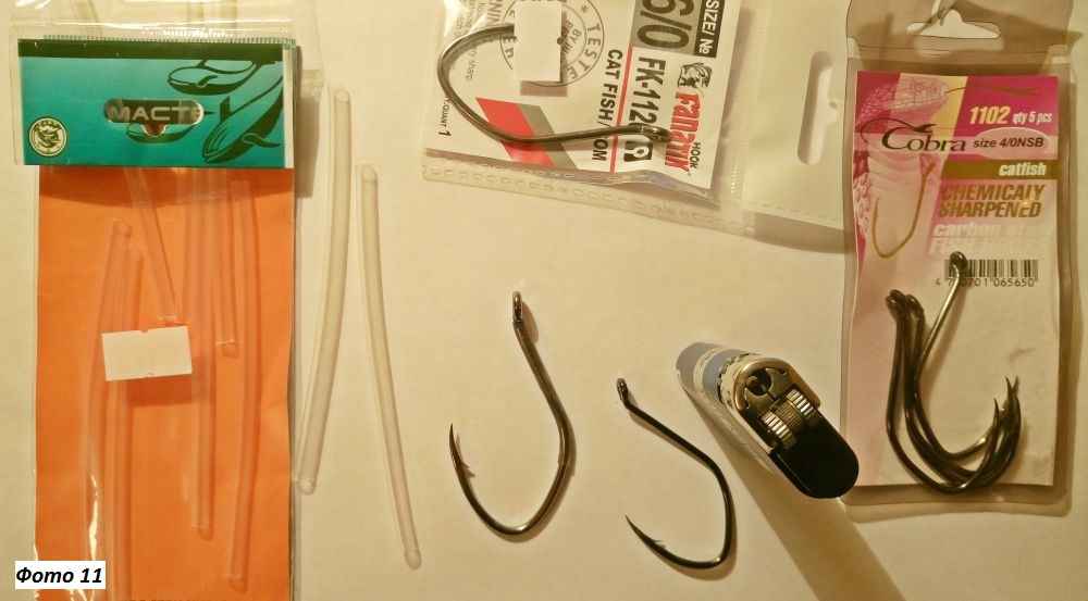 Коснулось сказанное и крючков. Советов на этот счет я услышал много, но порой прямо противоположных. Поэтому изначально приобретал мощные профильные крючки (размеры 4/0, 5/0, 6/0) и готовил их, закрывал цевье термоусадочной трубочкой (фото 11). Однако после нескольких рыбалок оказался недоволен этим выбором – количество холостых подсечек превысило результативные.