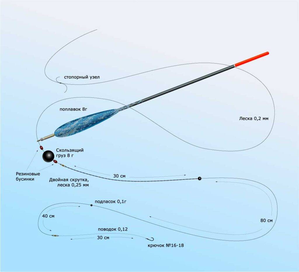 Диаметр основной лески 0,14 мм — поплавки от 5 до 8 гр, дистанция ловли 15-25 м, вес предполагаемого улова до 2,5-3 кг.
