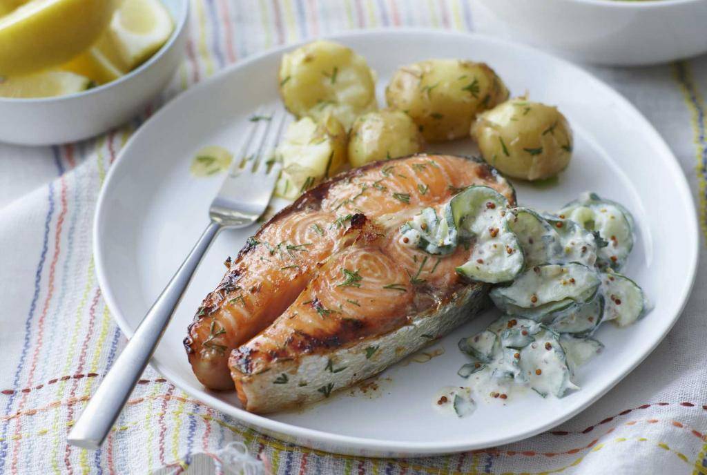 Салат с освежающим вкусом отлично сочетается с вареным картофелем. Огурец нарежьте небольшими кубиками 1 х 1 сантиметр. 3–4 перепелиных яйца сварите, остудите, очистите от скорлупы, разрежьте пополам. Спелое авокадо (без кожуры и косточки) нарежьте тонкими ломтиками. Таким же образом нарежьте и кисло-сладкое яблоко. Выложите ингредиенты на подушку из листьев шпината (можно заменить рукколой), затем выложите ломтики главракса, полейте заправкой.Для заправки смешайте 2 ст. л. лимонного сока с 1 ст. л. мёда и 1 ст. л. зернистой горчицы. Добавьте немного оливкового масла, а также соль и перец по вкусу.