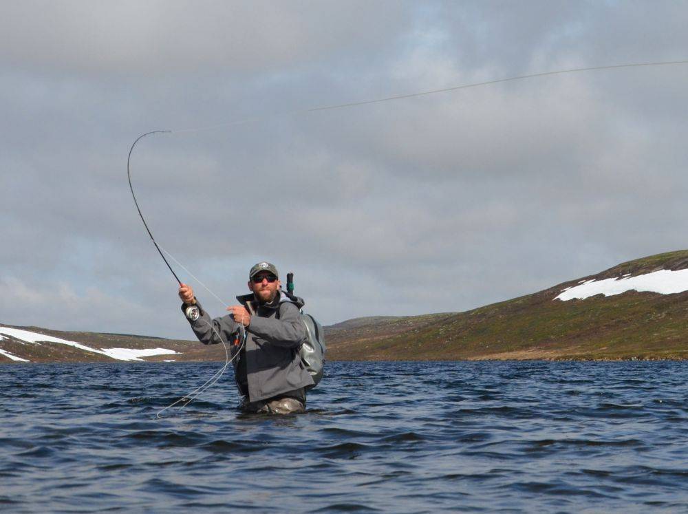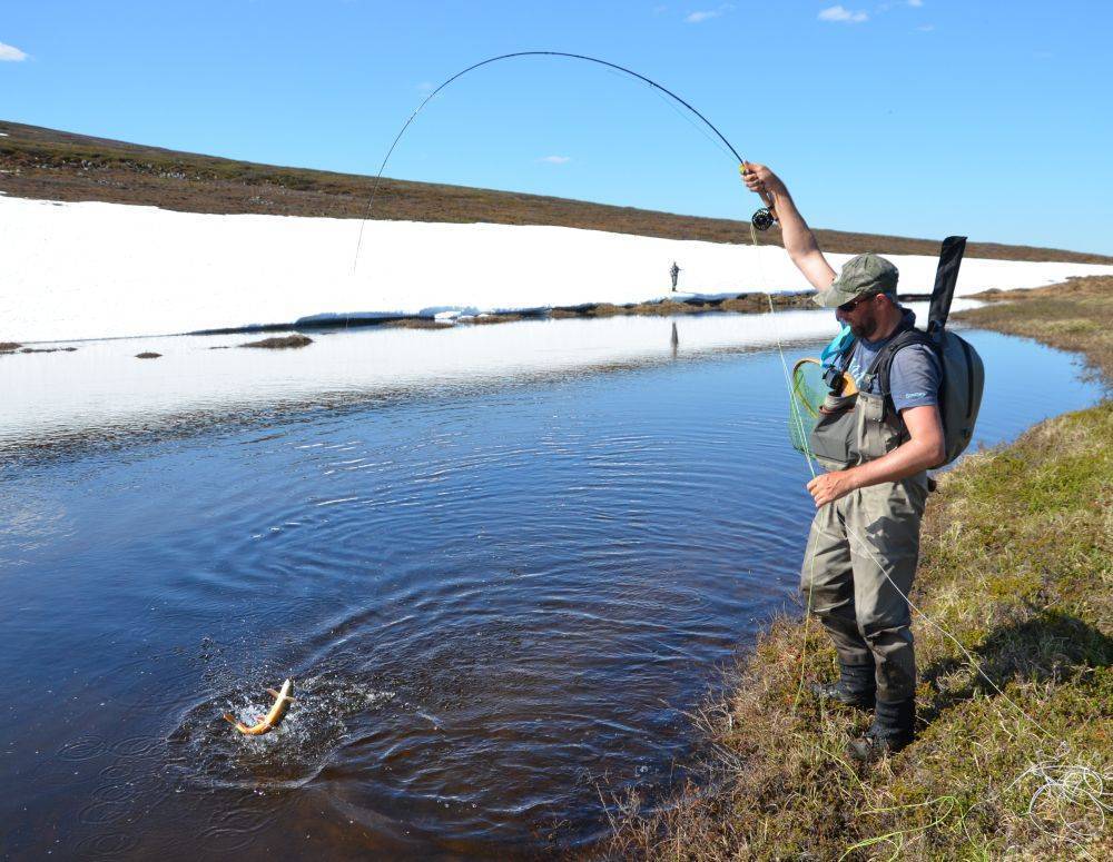 Арктический голец – весьма интересный трофей для нахлыстовиков. Не многие могут похвастать рыбалкой на эту рыбу. Голец нападет на насадку резко и даже агрессивно, но рыба часто меняет “настроение” и бывает, что поклёвку можно ждать довольно долго. В большинстве случаев условия рыбалки позволяют использовать более длинные удилища, которые дают возможность делать точные и далекие забросы. Для этого отлично подходят лёгкие двуручники и свитчи. Рыба чаще всего держится в нижних слоях воды, поэтому арктического гольца в основном ловят на отгруженные стримеры и мокрые мухи с использованием тонущих концов. В хорошую погоду голец активно реагирует на “бороздящие приманки”. Многие рыбаки отмечают, что именно на эту приманку было поймано нахлыстом большинство гольцов.