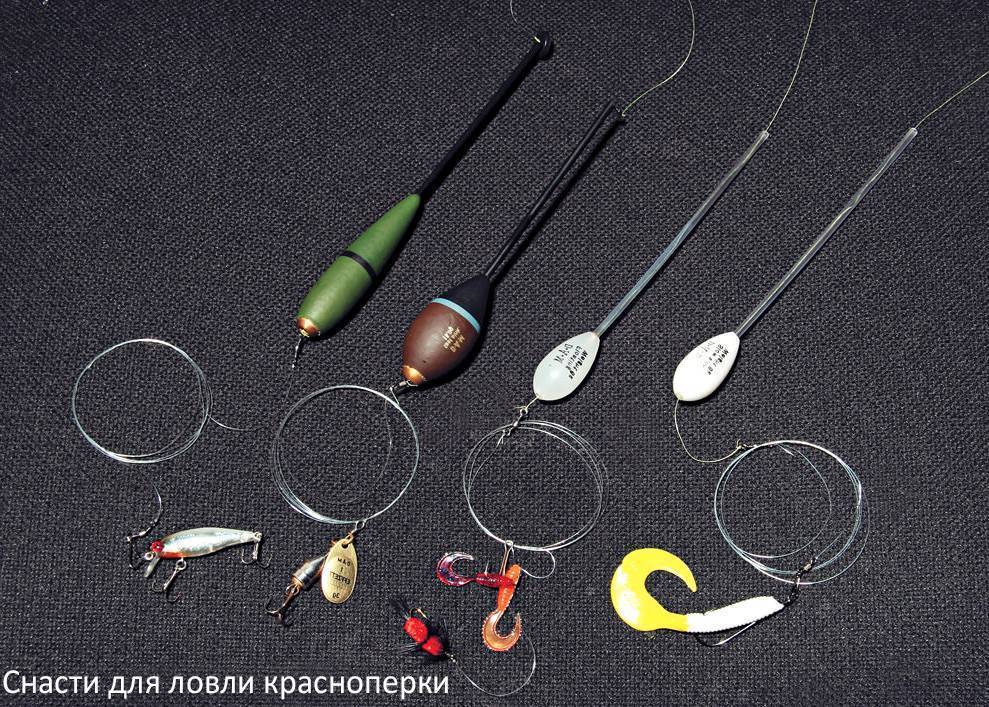 Для ловли красноперки подойдет не только леска средних размеров, но и тонкие варианты, так как рыба имеет маленькие размеры. При этом тонкая леска должна быть достаточно крепкой. Иначе вес водорослей, с которым часто вытаскивается улов, и резкие рывки могут ее порвать. Выбор снасти для ловли и метода ужения зависит от условий лова. Также на выбор влияет образ жизни рыбы (поверхностное или донное обитание).