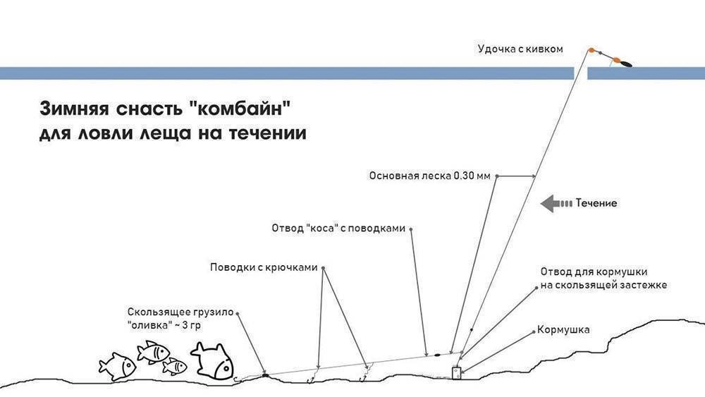 Вылов лещей в холодную пору на течении ведут различными методами. Их основой является одинаковое удилище.
