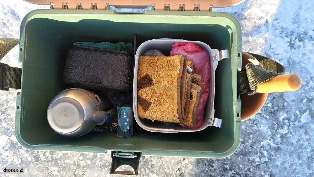 При транспортировке ведерко свободно входит внутрь ящика. В нём размещается термос, коробки, снасти и т.д. А на льду при подготовке к ловле я переношу там пакет с манкой, черпак и флажки. Затем вешаю на крючки на край ящика вместо заводского кармана. Содержу там опять же черпак, дозатор с манкой, полотенце, перчатки, а порой даже временно складываю рыбу.