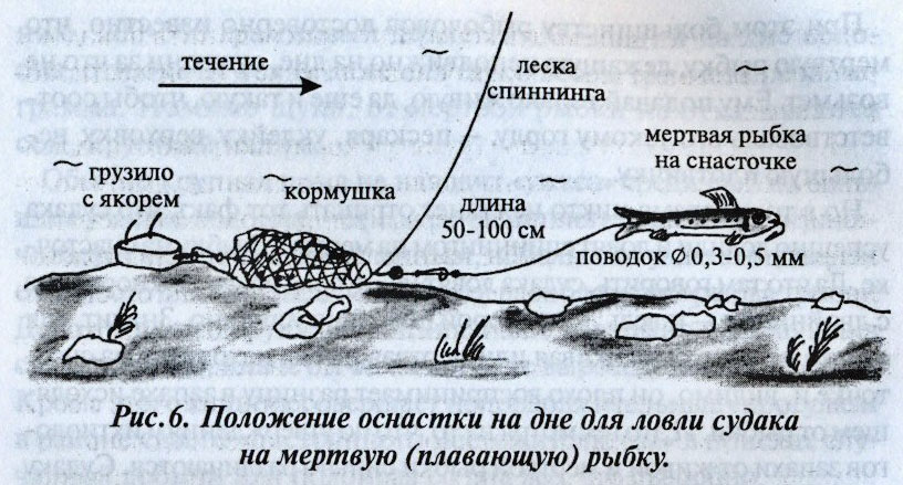 Грузик должен иметь круглую форму, что без труда катится по дну. Поводок используется один. Заброс выполняется всегда против течения, лишняя леска подтягивается. По кончику удочки определяется поклёвка.
