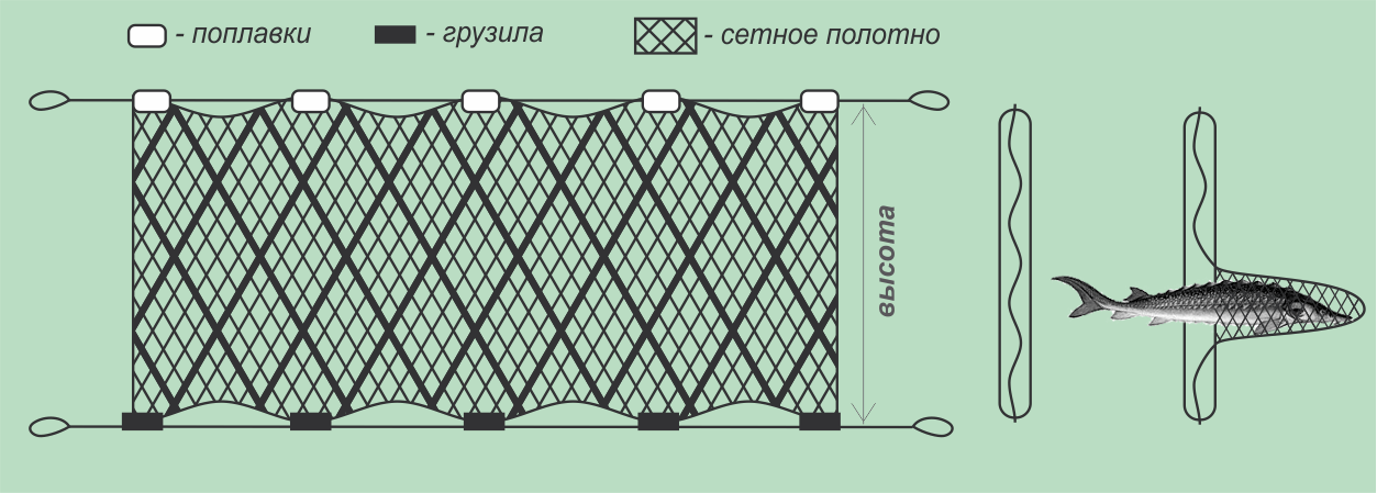 Шаг ячеи зависит от размера предполагаемой добычи. Высота сети редко превышает 1,5 м, а длина (при забросе с берега) – 7 м.