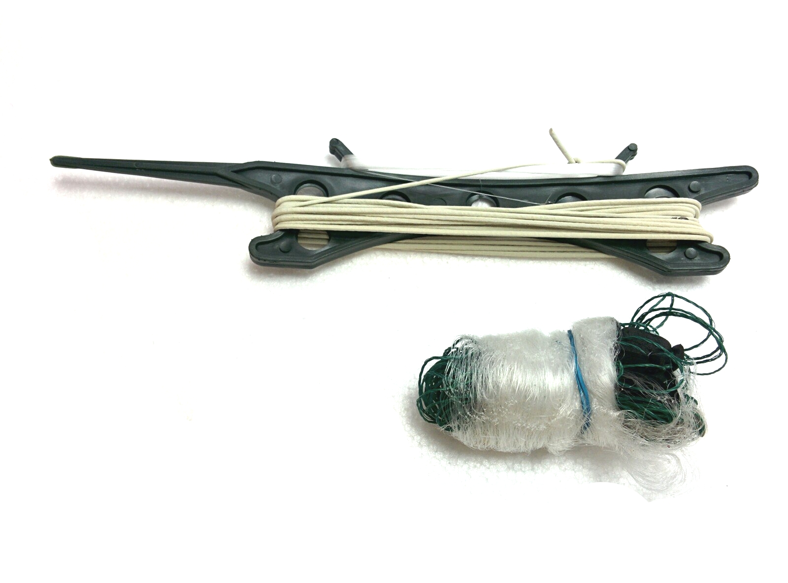Сама сеть в забросе обычно не участвует: леска и резинка соединяются при помощи двух металлических карабинов, а после заброса карабины рассоединяются и крепятся к петлям, сделанным на концах наплавного шнура. Вес карабинов компенсируется двумя большими пенопластовыми поплавками, они же способствуют тому, чтобы остаточное натяжение резинки не мешало сети стоять в воде правильным прямоугольником.
