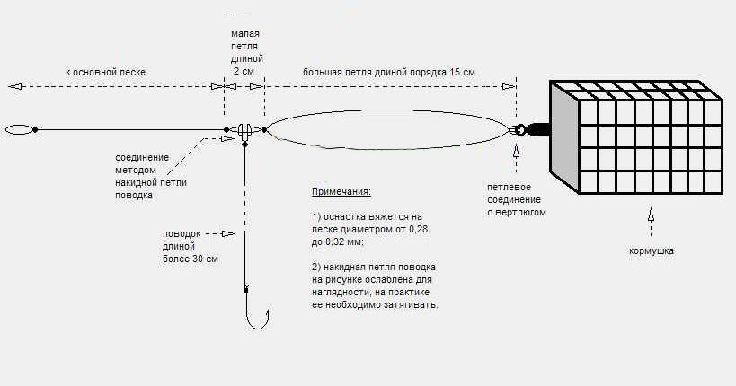 Из основной лески делается большая петля, с одной стороны которой крепится поводок с крючком, с другой – кормушка. Кормушку на определённом отрезке можно сделать скользящей. Чтобы предотвратить запутывание, на леске устанавливают – трубочку, изогнутую под тупым углом.