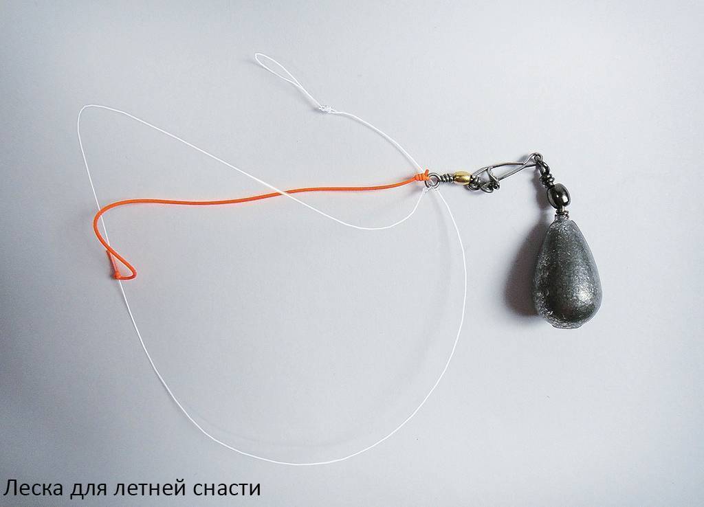 Леска для летней снасти имеет диаметр 0,2−0,25 мм. Ее необходимо продевать через кольца. Накладывают грузило. К концу лески привязывают поводок с крючком.