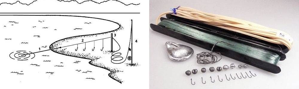 Основа намотана на мотовильце или обычной безынерционной катушке на спиннинге. После снаряжения крючков насадками, рыболов снимает петлю резины со стойки, и постепенно отпускает ее в воду.
