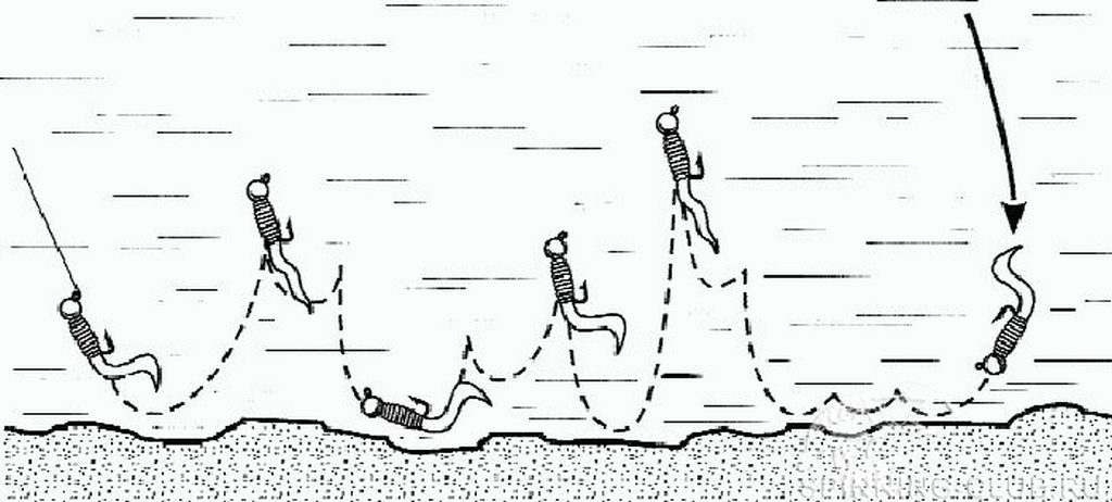Наиболее эффективными приманками при такой проводке являются твистеры и виброхвосты, которые своей активной игрой даже во время пауз в подмотке обращают на себя внимание хищника. Такой проводкой часто создается впечатление раненой или ослабевшей рыбки, пытающейся убежать, что максимально привлекает к ней хищную рыбу
