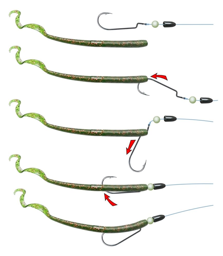 Силиконовую приманку нужно проткнуть с головы, вывести жало на 5 мм наружу, провести крючок сквозь тело приманки, повернуть и, натянуть червя на ступеньку крючка, а потом проткнуть приманку ещё раз и вывести жало наружу, жало должно плотно прилегать к телу приманки.