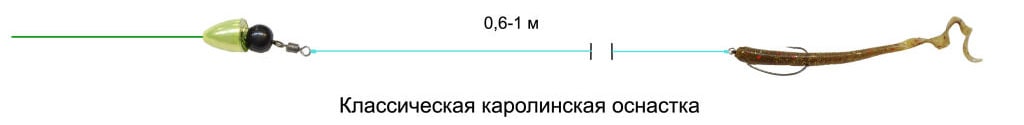 В каролинской оснастке основной шнур продевается в скользящее грузило в виде пули или оливки, далее, к нему, через вертлюг, привязывается поводок длиной 0,5-1,5 м с приманкой.