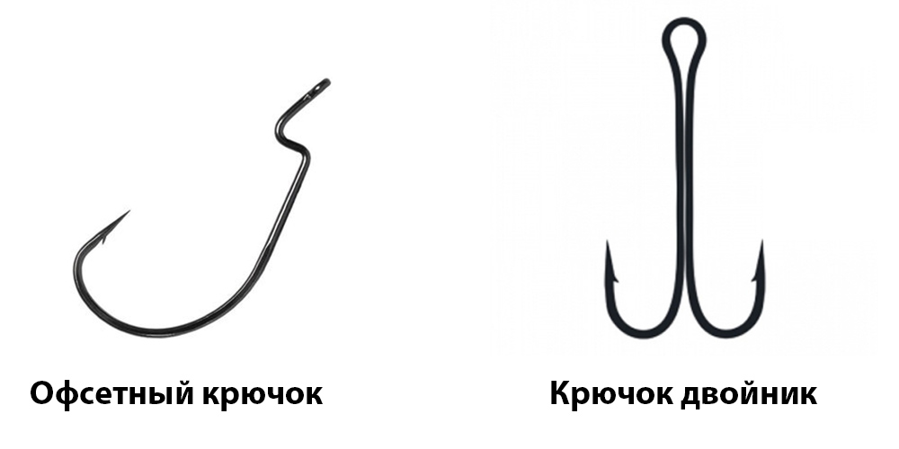 При ловле на джиг-риг используют либо офсетники, либо двойники. Последние обычно применяют при целенаправленной ловле судака или берша. Офсетные крючки для данной оснастки применяются чаще. Более того, некоторые особенности данного монтажа при определённых условиях ловли предполагают использование именно одинарного офсетника. Например, когда речь идёт о ловле на мелководном участке водоёма, дно которого поросло растительностью или усеяно опавшей листвой. Понятно, что торчащие из тела приманки жала двойника здесь будут попросту неуместны. Подбор размера крючков зависит от размера приманки, размер и вид которой в свою очередь, зависит от тех рыб, которые собираемся ловить.