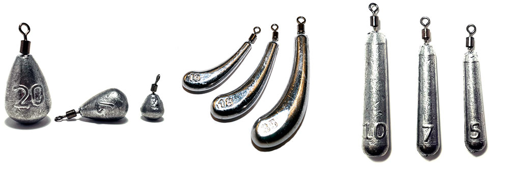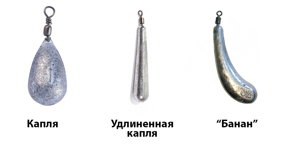 Как правило применяют три вида грузил: обычная или удлинённая капля и так называемый «банан». Грузила могут иметь как стальную петлю, так и впаянный вертлюжок. При использовании заводных колец желательно, чтобы проушина петли была побольше. Вес грузил, соответственно, нужно выбирать исходя из условий ловли, а также теста применяемого спиннинга. В принципе, в качестве груза можно использовать и «чебурашки», но только в случае, когда запас специальных грузил либо отсутствует вовсе или каким-то образом закончился во время рыбалки.