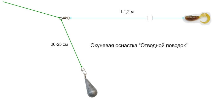 В «отводном» поводке основной шнур вяжется к трехстороннему вертлюгу, к другим колечкам привязывается грузило на 20-40-сантиметровом поводке и поводок длиной 1-1,5 м с крючком и приманкой на конце.
