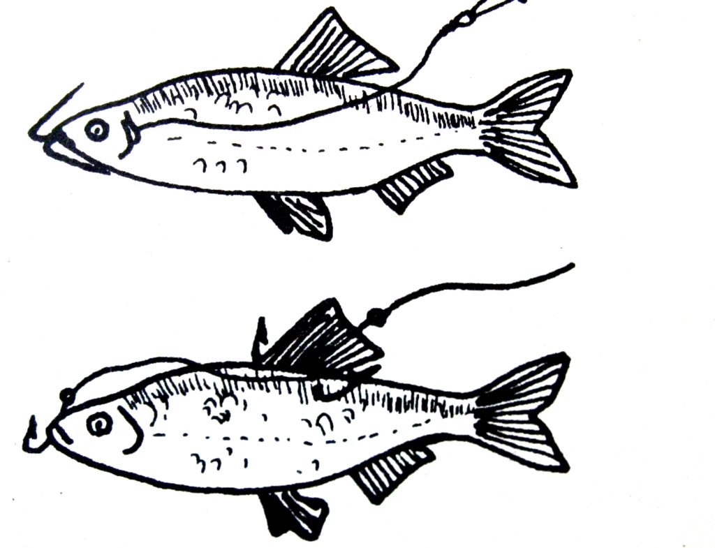 Насаживается малек на крючок за верхнюю губу, не рекомендуется насаживать рыбку за обе губы, это ее сильнее травмирует, и в воде она будет вести себя вяло, а может и во все оставаться без движений. При низкой активности хищника малька насаживают под верхний плавник, конечно, такой способ причиняет больший вред рыбке и она быстрее погибает, однако в первые несколько минут вести себя живец будет активно.