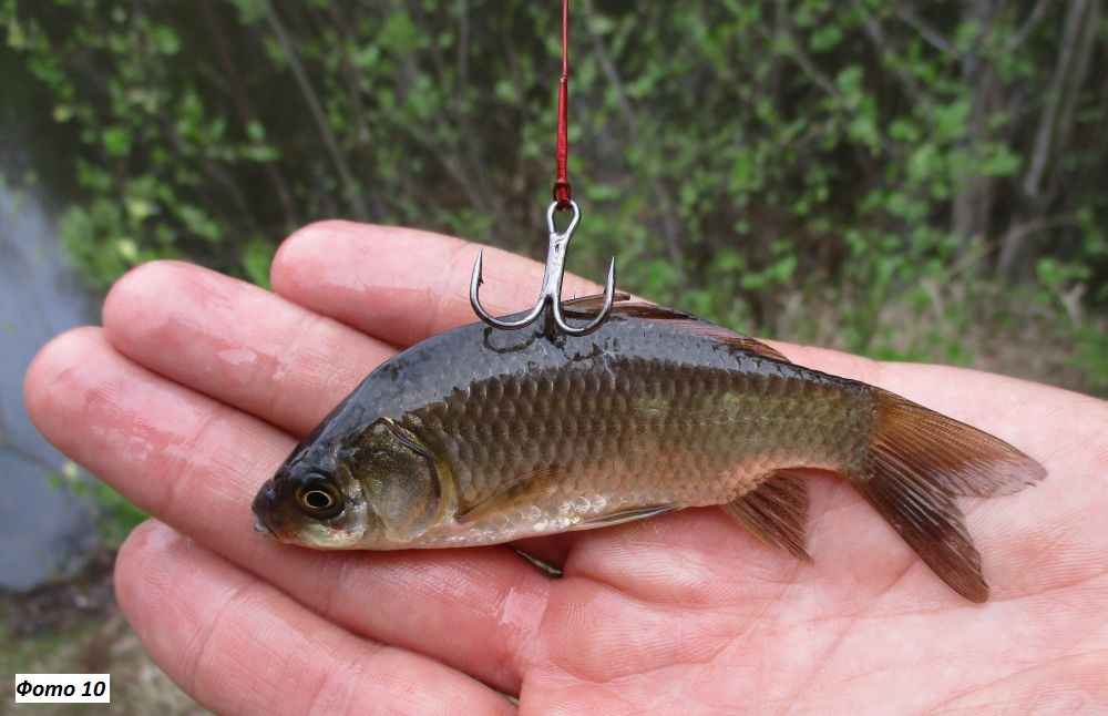 Если мы ловим щуку на поплавочную удочку, то используем в качестве живца карасика, плотву, пескаря или окуня. Как его цеплять – это вопрос. Самый обычный вариант – заводить двойник или тройник под спинной плавник (фото 10). Живец чувствует себя хорошо продолжительное время, его можно перезакидывать, он достаточно активен в своем перемещении. Но есть нюанс.