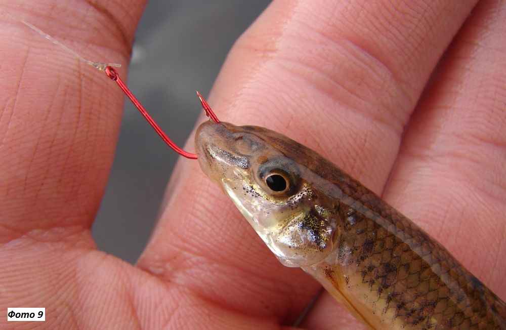 Для поплавочной ловли окуня, я считаю, самый оптимальный живец – это небольшой пескарь или уклейка (фото 8). Подойдет также небольшая плотвичка или красноперка. Как правило, малька для ловли полосатого мы цепляем под губы (фото 9). В таком положении живчик долгое время остается подвижным и активным.