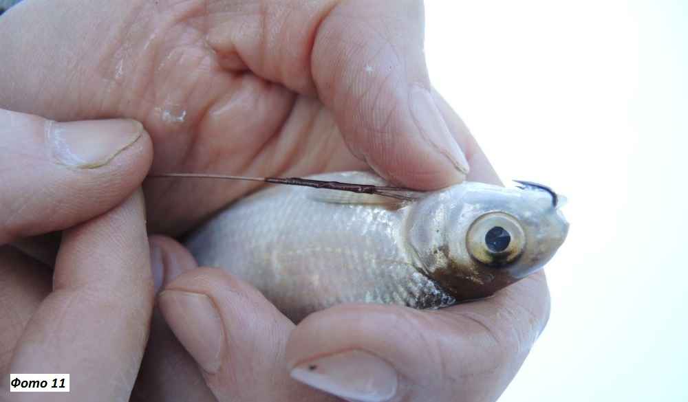 Летом же такой вольности нет – и хорошо, если, клюнув, щука юркнула в прибрежную растительность, но если она решила поскорее уйти от вас в сторону, то тут уж остается надеяться на удачу, делая подсечку в надежде, что ваш тройник сумеет зацепить щуку. Вот для подобных случаев есть и другой вариант насаживания живца при ловле на поплавочную удочку – под жабры. Заводите конец поводка под жаберную крышку, выводите в рот и цепляйте к нему двойник, помещая его в рот живца (фото 11).