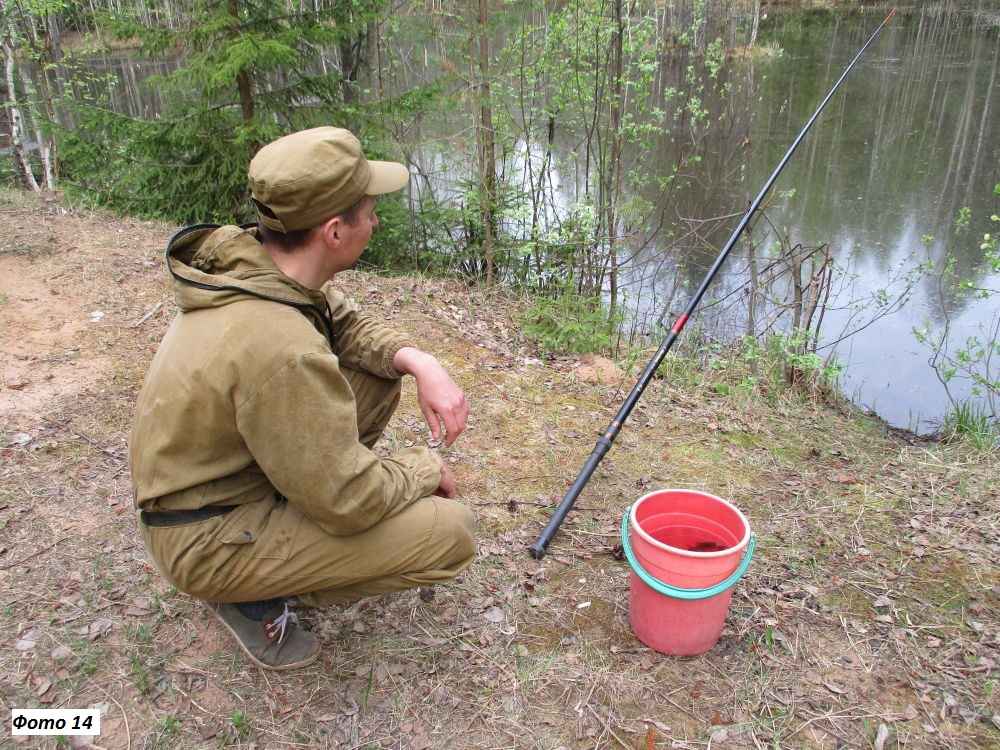 Если за это время поклевки не случилось – стоит поискать удачу в следующем месте. На окуневую живцовую ловлю я обычно беру две – три удочки. Если рыба активная, то достаточно будет и одной, чтобы интересно и азартно ловить его. Но если я пока не нашел «полосатиков», то расставляю три удочки в разных местах – и, контролируя их (фото 14), вскоре смогу найти наиболее удачный для рыбалки участок и перейти на него окончательно.
