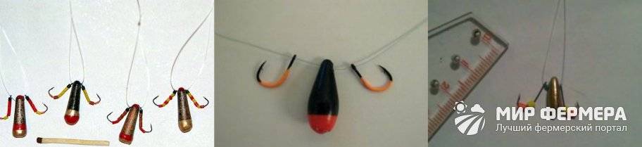 Крючки подбираются размеров 4 или 5. Между ними на леске должен оказаться грузик, после чего леска собирается в петлю, и фиксируется посредством вертлюжка. На этом основная часть изготовления завершена.