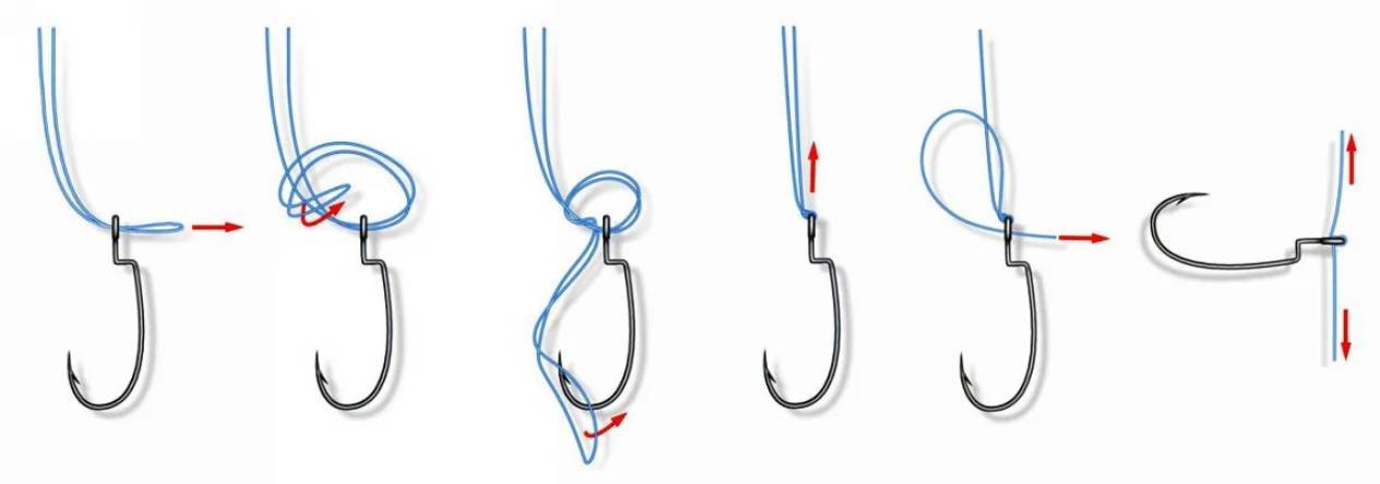 - Отступив от груза от 30 до 70 см, к леске привязывают крючок. Расстояние между крючком и грузилом зависит от того, на каком уровне от дна должна идти приманка. Крючок должен быть расположен по углом 90 градусов к леске и смотреть жалом вверх. Для привязывания крючка к леске используется узел Паломар.