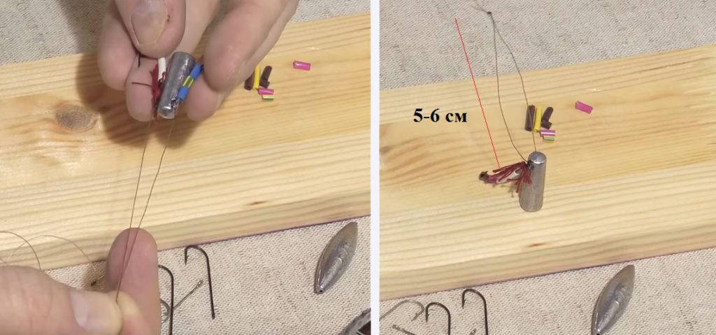Следующий этап заключается в подборе крючков для заготовок. Длина крючка меньше длины грузила – это основное условие подбора. На крючки можно одеть разноцветные кембрики, после чего снасть можно монтировать. Монтаж заключается в том, что леска продевается в таком порядке: крючок, грузило, крючок. После этого вяжется незатягивающийся узел. В итоге, можно отправляться на рыбалку.