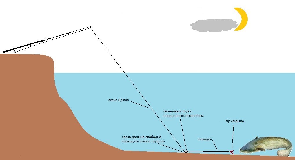 Рыбалка на сома в ночное время суток имеет несколько преимуществ. Хищник обычно кормится в по ночам, поэтому выплывает из своих глубоких ям, доступ в которые закрыт корягами и различным хламом.