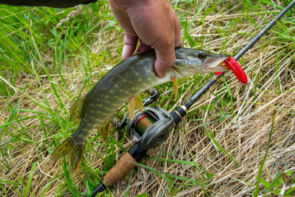 Для ловли некрупной щуки в траве подойдут легкие снасти в диапазоне L – ML-L. Использовать более тяжелые снасти не имеет никакого смысла, только устанете во время рыбалки махать, например, удилищем класса MH или H. Использовать снасти класса «ультралайт» тоже нет особого смысла, если толь вы не приверженец этого вида ловли и ловите на UL везде и всегда. Длина удилища при ловле травянки от 2,1 до 2,7 метра. Строй подойдет любой – от полупараболика до экстрафаст. В такой ловле строй особенной роли не играет. Не берите только удилища с чисто параболическим строем. Вы не сможете просечь щуке пасть при поклевке даже при размашистой подсечке.