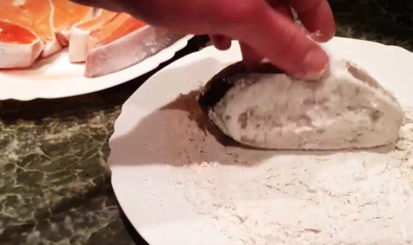 3.На сковороде накалить немного постного масла. Пока оно закипает, обвалять тщательно каждый кусочек рыбы в мучной смеси. Когда масло закипит, отправить туда стейки и прожарить до румянца с двух сторон.