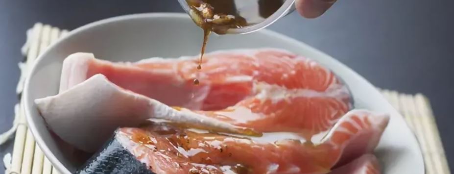 - Обмажьте куски семги или другой красной рыбы получившимся соусом. Дайте им полежать в нем полчаса.