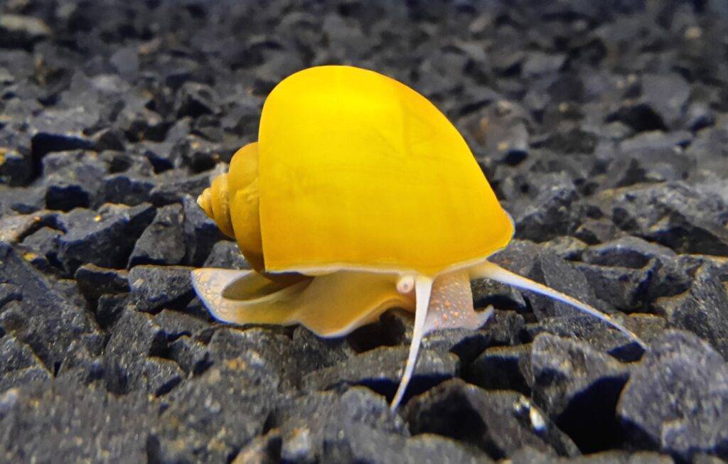 Улитка аквариумная ампулярия. Достаточно крупный вид родом из Южной Америки. Довольно теплолюбивы и чувствительны к содержанию кислорода в воде. Когда его мало — поднимаются на поверхность. Особи раздельнополы, а икру откладывают над водой. Для того, чтобы улитки размножались, уровень воды должен не доходить до края на 15 см. Живут желтые аквариумные улитки до трех лет.