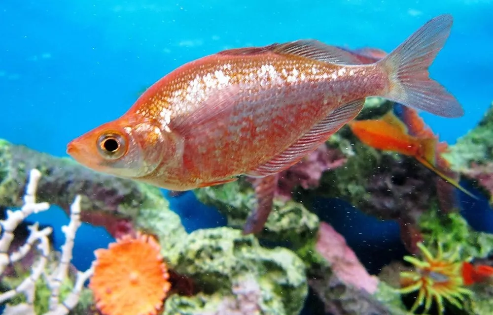 Голубовато-розовый оттенок чешуи имеет серый отлив, который играет неоновым при попадании на них солнечных лучей.