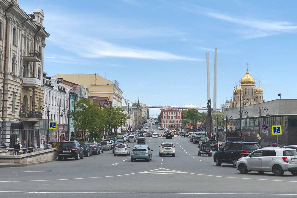 Вид на недостроенный собор и Золотой мост. Во Владивостоке большинство машин праворульные — это отличительная черта края