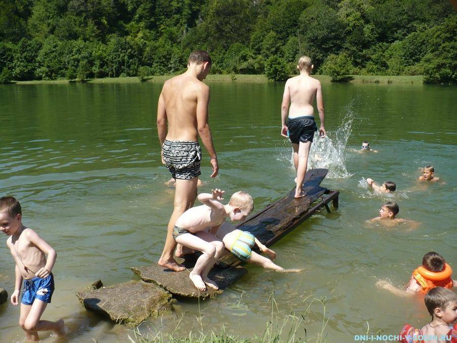 Купание в озере как для сочинцев, так и для гостей города, является редкостью – в основном в море. Ну раз уж представилась такая возможность конечно не стоило её упускать. Зеленоватая поверхность озера надёжно скрывала дно Барановского озера. Из чего оно состоит: ила, песка или камней – мог узнать только тот, кто решит искупаться. Несмотря на непрозрачность, вода мутной не была а мелкие камушки под ногами приятно удивили. Глубина у берега позволяла радостной детворе спокойно купаться и прыгать с небольшого деревянного мостика.