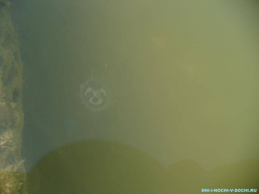 Было очень интересно узнать живёт ли какая-нибудь живность в этом озере. Думалось почему-то исключительно о рыбе: карп, сазан или форель обычно выпускаются в такие водоёмы для рыбалки. Но рыбаков было не видно. Зато видно стало другое – что-то длинное и юркое крутилось возле нас думая что предпринять. “Чёрный шнурок” никого не боялся и оказался змеёй! Пулей вылетев из воды и оказавшись на спасительной суше – объявили всем о наличии змеи, которая к тому времени скрылась под мостиком с детворой. Кроме нас никто не обратил на возможную опасность никакого внимания, заявив что змеи в воде не кусаются, и продолжили плескаться с ещё большим рвением. Народ сегодня собрался смелый – искупаться спешили все, даже мамы с младенцами… Лезть обратно в воду совсем расхотелось, но загорать на берегу и рассматривать зелёное озеро тоже было интересно. Минут через пять спокойного созерцания водной глади, озеро явило нам ещё один сюрприз. У самой поверхности, размером с рублёвую монету плавали маленькие медузы!