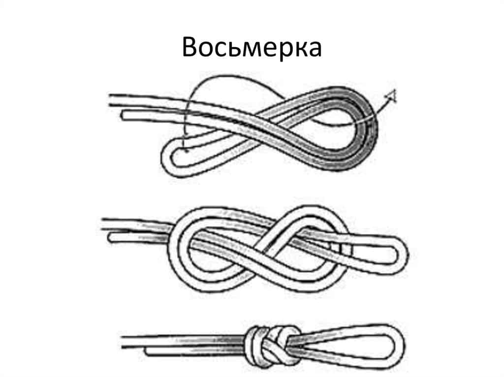 Чтобы связать восьмерку, на конце сложенной пополам веревки формируют одноименную цифру и затягивают так, как показывает схема.