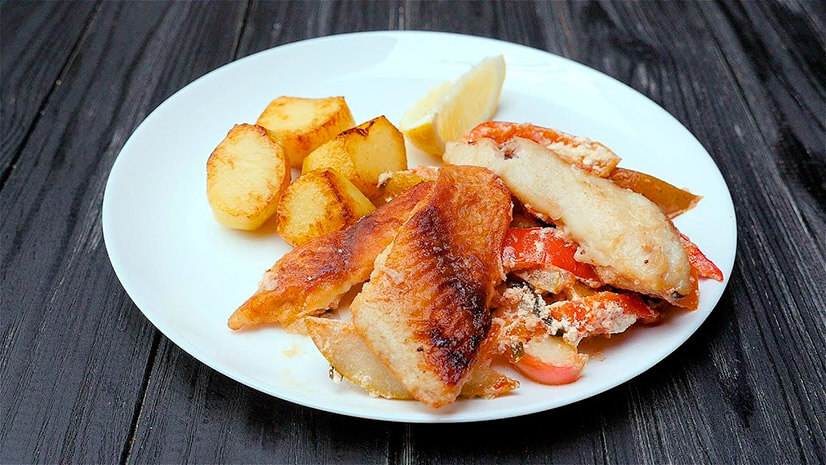Морской окунь, замеченный в духовке с лимоном, луком, морковью – простой рецепт