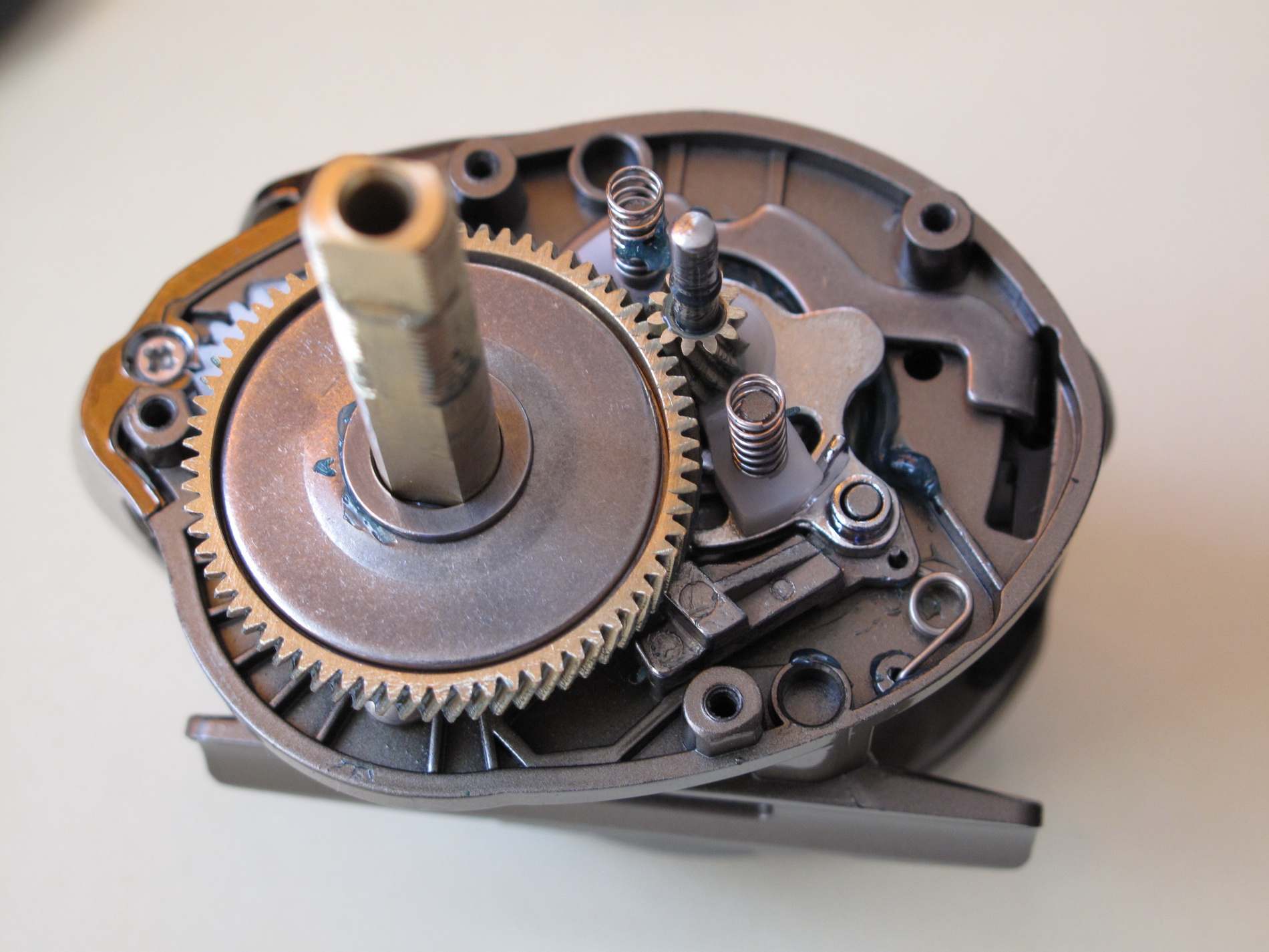 При сборке, штырек маленькой шестерни должен попасть в паз накрывающей его детали. Основную шестерню нужно смазать в нескольких местах и установить в корпус катушки. Далее смазываете шток по всей длине густой смазкой и устанавливаете на место. Основной механизм катушки смазан!