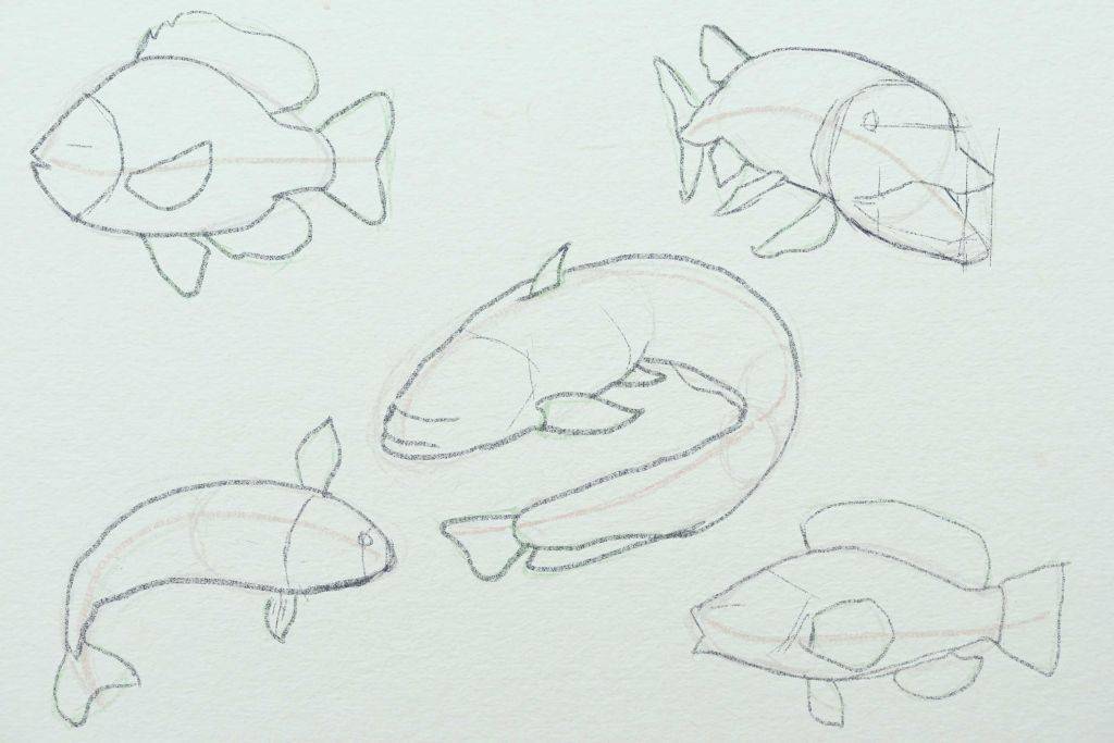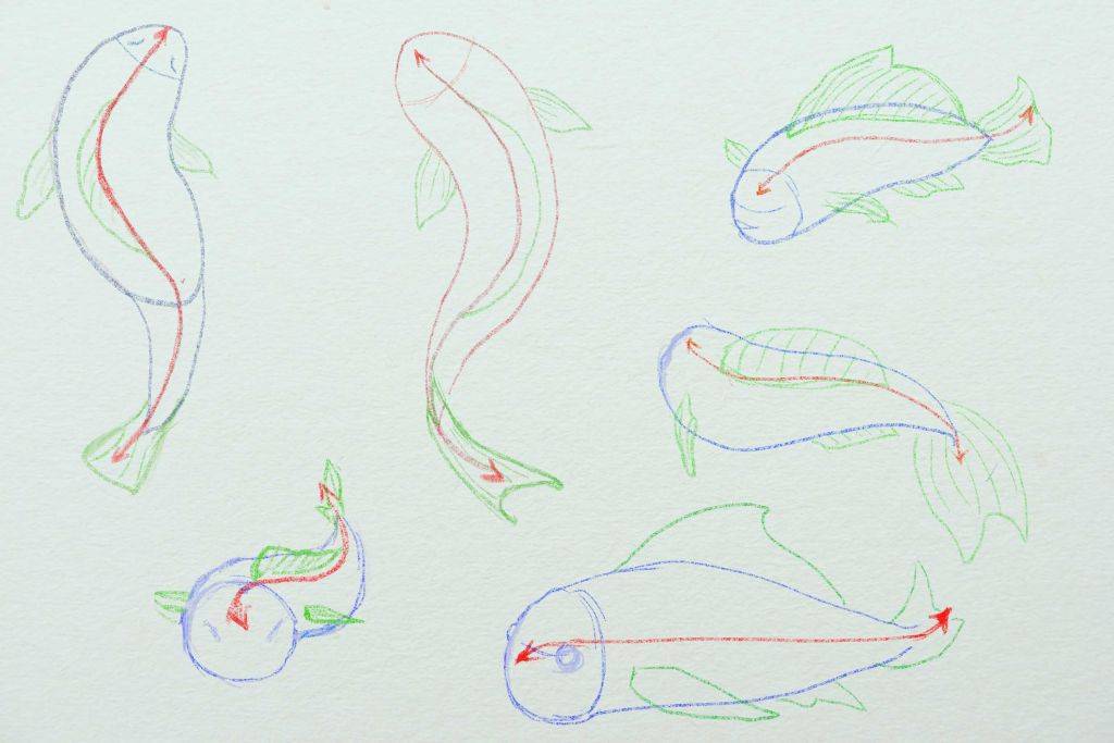Когда рыба плывет ее позвоночник извивается волнообразно, поэтому начинаем из линии, обозначающей движение: