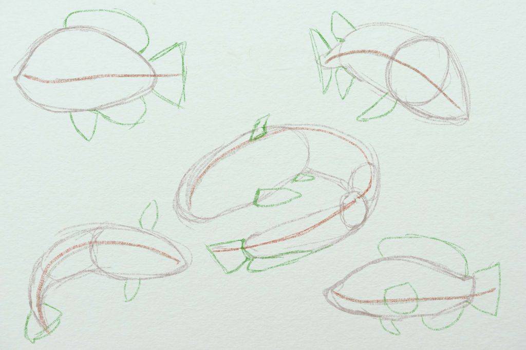Простой геометрической фигурой намечаем туловище и голову, а потом прикрепляем к нему плавники и хвост. Таким образом получаем приблизительный силуэт. В непростом ракурсе можно легко вписать в туловище круги или овалы, так набросок приобретет более понятный и объемный вид.